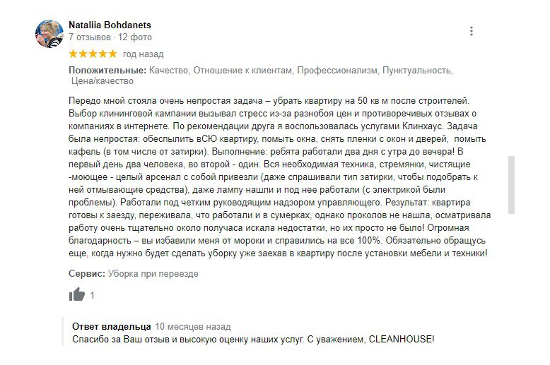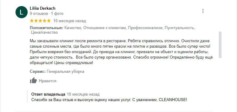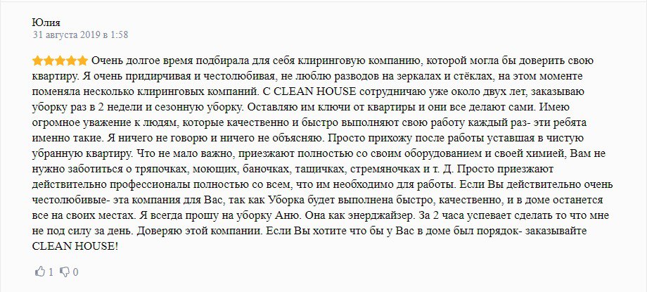 Очень долгое время подбирала для себя клининговую компанию, которой могла бы доверить свою квартиру. Я очень придирчивая и честолюбивая, не люблю разводов на зеркалах и стёклах, на этом моменте поменяла несколько клиринговых компаний. С CLEAN HOUSE сотрудничаю уже около двух лет, заказываю уборку раз в 2 недели и сезонную уборку. Оставляю им ключи от квартиры и они все делают сами. Имею огромное уважение к людям, которые качественно и быстро выполняют свою работу каждый раз- эти ребята именно такие. Я ничего не говорю и ничего не объясняю. Просто прихожу после работы уставшая в чистую убранную квартиру. Что не мало важно, приезжают полностью со своим оборудованием и своей химией, Вам не нужно заботиться о тряпочках, моющих, баночках, тащичках, стремяночках и т. Д. Просто приезжают действительно профессионалы полностью со всем, что им необходимо для работы. Если Вы действительно очень честолюбивые- эта компания для Вас, так как Уборка будет выполнена быстро, качественно, и в доме останется все на своих местах. Я всегда прошу на уборку Аню. Она как энерджайзер. За 2 часа успевает сделать то что мне не под силу за день. Доверяю этой компании. Если Вы хотите что бы у Вас в доме был порядок- заказывайте CLEAN HOUSE!