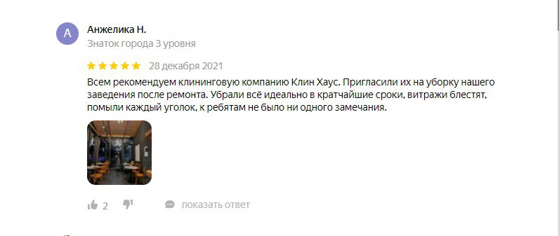 Всем рекомендуем клининговую компанию Клин Хаус. Пригласили их на уборку нашего заведения после ремонта. Убрали всё идеально в кратчайшие сроки, витражи блестят, помыли каждый уголок, к ребятам не было ни одного замечания.