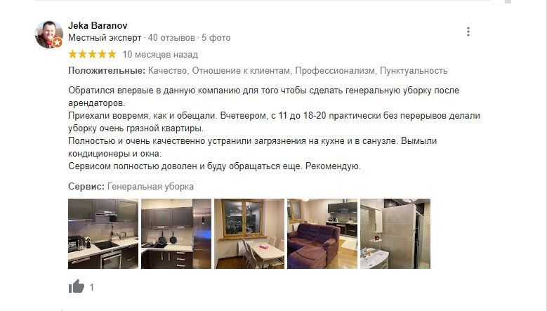 Обратился впервые в данную компанию для того чтобы сделать генеральную уборку после арендаторов. Приехали вовремя, как и обещали. Вчетвером, с 11 до 18-20 практически без перерывов делали уборку очень грязной квартиры. Полностью и очень качественно устранили загрязнения на кухне и в санузле. Вымыли кондиционеры и окна. Сервисом полностью доволен и буду обращаться еще. Рекомендую.